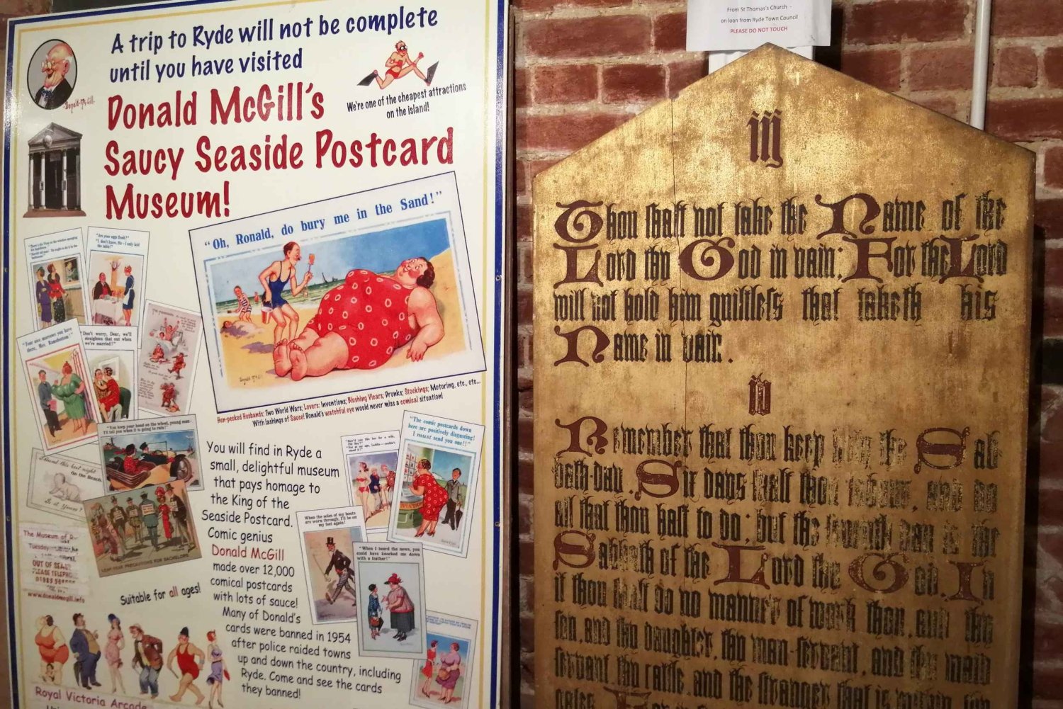 Oplev historien om Ryde og dens folk på det underjordiske Museum of Ryde. Gå derefter på opdagelse i det verdensberømte Donald McGill 'Saucy Seaside' Postcard Museum. Gennemse hundredvis af genstande, tusindvis af billeder og masser af frække postkort. Søg i museets fotoarkiv med over 10.000 billeder af Ryde og omegn fra 1860'erne til i dag. The Commercial Room rummer en stor samling af flasker, flakoner og andre genstande fra lokale bryggerier, apoteker og mejerier. Gennemse information og fotos fra de sidste 150 års shopping i Ryde, og se bl.a. et urværk med spyttebakke, medicinsk udstyr, klokker til tjenestefolk, butiksskilte og gamle plakater. Se uddannelse, som den var engang, i School Room! Se gamle skolebilleder og en video, der viser feriefilm fra sidste århundrede. På den modsatte side kan du se historien om Ryde Pier (den første mole i landet) og dens udvikling med senere sporvogns- og togmoler. Ved siden af kan du se detaljer om mange af de tidlige lokale fotografer, hvoraf en havde dronning Victoria og hendes familie blandt sine kunder. I Flight Path kan du lære om den for længst forsvundne Ryde Airport og den lokalt byggede Hovercraft, som stadig er i drift; en film viser dens udvikling. Rotunda-området indeholder militærrummene med genstande fra Isle of Wight Rifles og begge verdenskrige samt resterne af to USAF P41-D Mustangs fra anden verdenskrig, som styrtede ned i Solent. Man kan også se den tidlige begyndelse på Isle of Wight Festival, minder fra den Oscar-vindende filminstruktør Anthony Minghella og 140 år med Ryde Carnival. Husholdningsrummet viser gamle hverdagsgenstande (nogle bruges stadig af besøgende!), ting fra politi og brandvæsen og videoen 'Great Fires of Ryde'. Tony Packer Room huser vores unikke Ice Well (bygget til at rumme is fra Norge og Nordamerika) og en nyligt afdækket brødovn samt forskellige genstande fra St Thomas's Church og vores arkiv med filer, kort og diagrammer af lokal interesse. I Transport and Sport Room kan du se detaljer om de første busser på øen og anden lokal transport, læse om de forskellige sportsfolk fra Ryde og se genstande og billeder fra de for længst nedlagte hospitaler i området. Og også ... Få et godt grin på Donald McGill 'Saucy Seaside' Postcard Museum. Denne privatejede udstilling, som åbnede i nærheden i 2010, blev flyttet til Museum of Ryde i 2014. Det er verdens største samling af Donald McGill-genstande og en hyldest til den mest kendte postkortkunstner nogensinde. McGill, som blev født i 1875 og uddannet som tegner, begyndte at tegne tegneserier i 1904, og frem til 1962 producerede han mere end 12.000 designs, mange med Benny Hill-agtig humor. Nogle af kortene blev anset for at være uanstændige i forskellige retssager i 1950'erne, og 3.000 blev destrueret alene i Ryde. Bliv forbløffet over, hvad der var så chokerende for kun 70 år siden, og køb og send genoptryk af disse kort. Man kan sagtens bruge timer her på at udforske det hele! Behold din billet for gratis returnering inden for fjorten dage.Includes